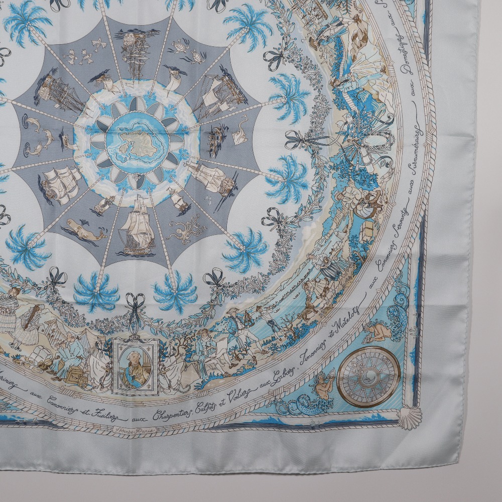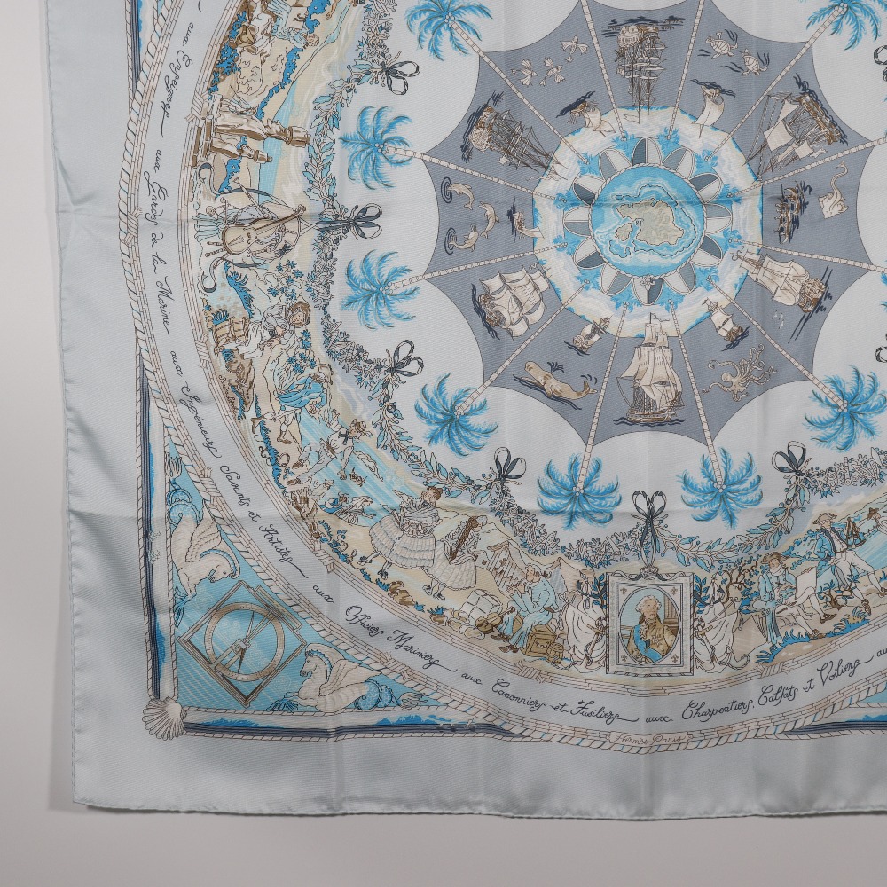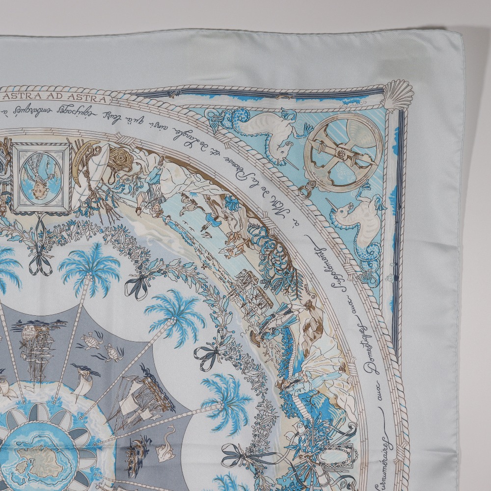 エルメスの人気スカーフ「カレ90」シリーズより、**PER ASTRA AD ASTRA(ペル・アストラ・アド・アストラ/困難を通じて天へ)**デザインの一枚です。 ラテン語のタイトルが示すように、“試練を乗り越えて高みへ向かう”というテーマを、壮大な航海や星のモチーフを通して美しく表現しています。 淡いライトブルーとホワイトを基調に、繊細なゴールドのラインが煌めく上品な配色。 船や羅針盤、天体などが放射状に描かれ、まるで宇宙と海を旅するような幻想的なデザインが魅力です。 首元に巻くだけでなく、バッグやヘアアクセサリーとして、またインテリアとして額装するのもおすすめ。 シルク100%ならではのしっとりとした光沢と滑らかな手触りが、エルメスならではの高級感を引き立てます。