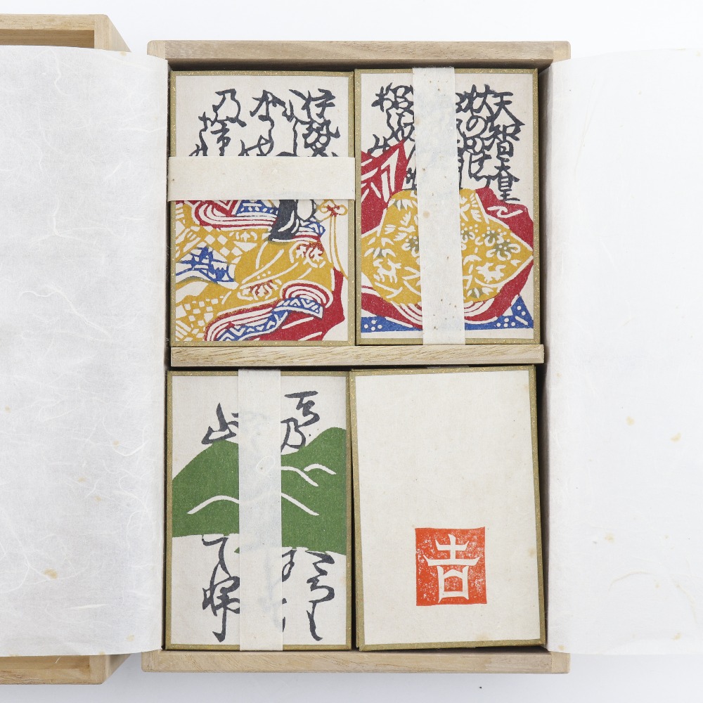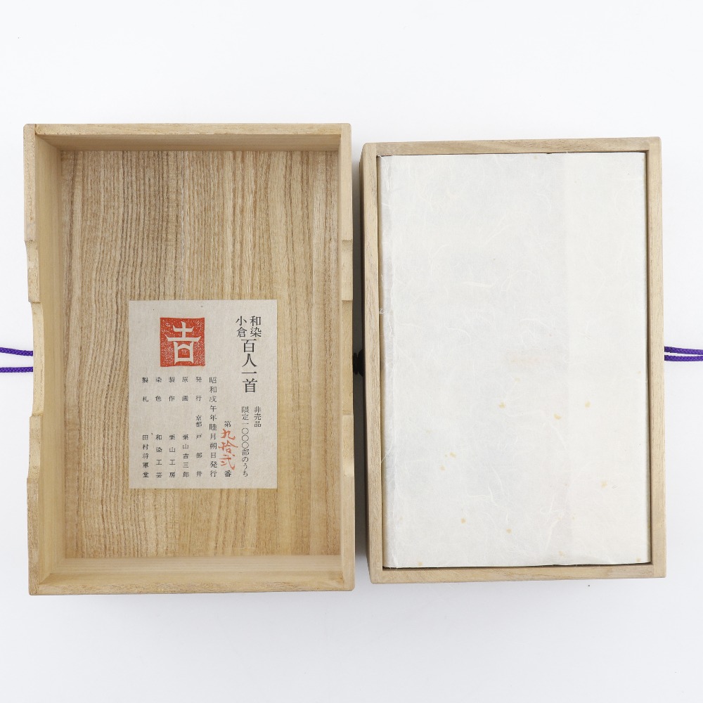 昭和戌午年睦月朔日発行の和染小倉百人一首です。 非売品で1,000部限定で作成された貴重なものです。 限定1,000部のうち92番。 原画:栗山吉三郎 製作:栗山工房 染色:和染工芸 製札:田村将軍堂